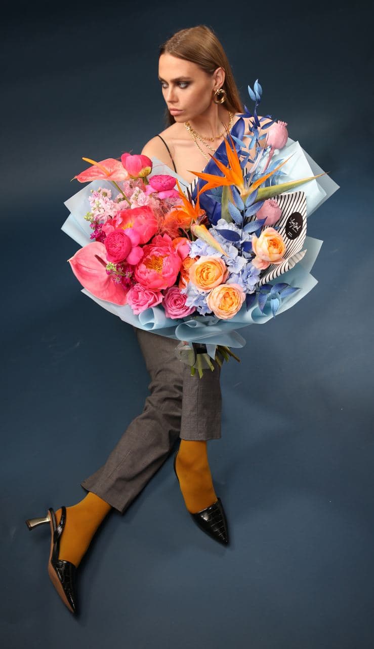 В букете использованы пионы Coral Charm и пионовидные розы двух сортов, олицетворяющие открытую женскую энергию. Очаровательные стрелиции, похожие на райские птицы придают букету богемный шик. Синие вкрапления декоративных листьев поддерживают главный цвет бренда, а упаковка идеально обрамляет саму композицию.